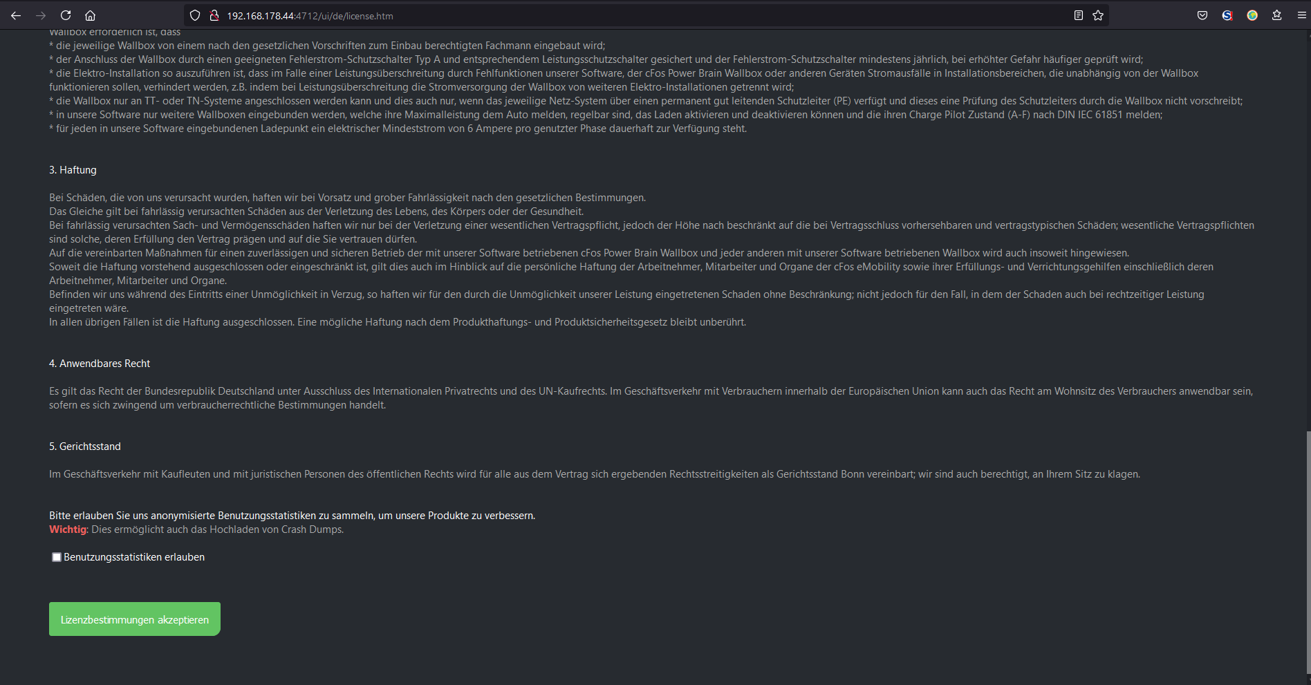Nun lesen und akzeptieren Sie die Lizenzbestimmungen. Dann können Sie den cFos Charging Manager nach Belieben einrichten. Weiteres entnehmen Sie bitte der Inbetriebnahme-Anleitung.