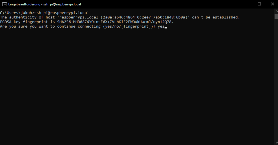 Im Anschluss werden Sie gebeten die Authentizität des Hosts zu bestätigen. Das dient dazu "man-in-the-middle" Angriffe zu verhindern. Da sich der Host (Ihr Raspberry Pi) in Ihrem lokalen Netzwerk befindet, können Sie diese Meldung mit "yes" bestätigen.